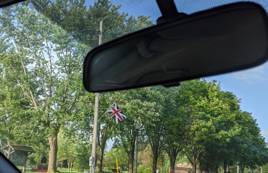 というわけで、キングストンに行く途中、「英米戦争」でイギリス帝国側について戦ったことを今でも自慢に思っている小さな町を偶然通過しました。不思議なのは、その町にはたくさんはためいているユニオンジャックが、アイルランドのバッテンが入っていない、古いユニオンジャックなのです。あえて、古いものを揃えているというのは何か理由があるってことですが、誰に聞くこともなく、通り過ぎました。