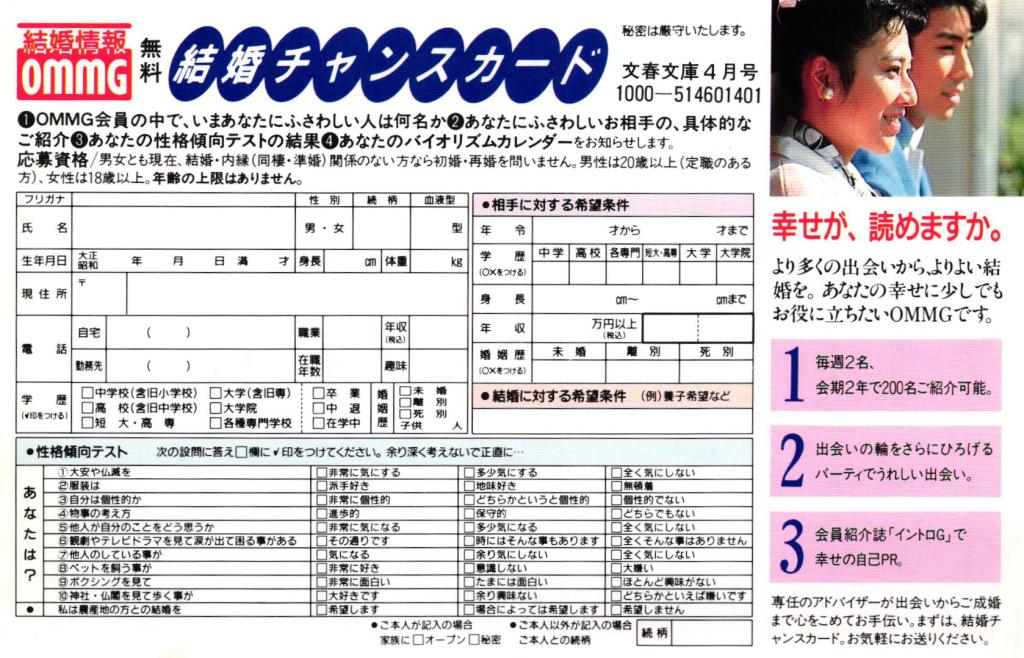 さて昨年、瀬戸内寂聴が亡くなり、なんとなく瀬戸内晴美時代の小説が読みたいなと思って『女優』を買いました。1978年初版。文庫本のフォントサイズがめちゃくちゃ小さい。ペラペラとページをめくっていたら、婚活カードが出てきました。平成2年。